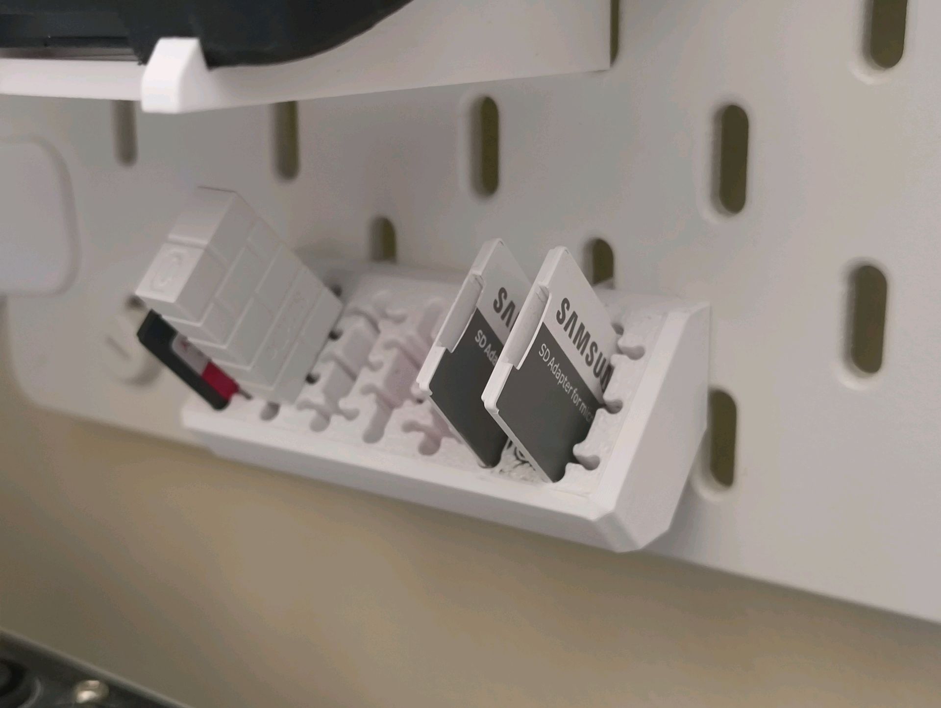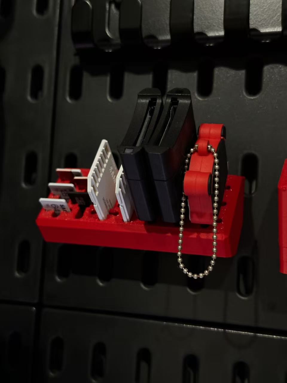 Design Multi-Formato Universal Não compre um suporte para cada tipo de acessório. Esta peça impressa em 3D foi desenhada com uma grelha de ranhuras inteligentes e versáteis. Num único bloco, pode encaixar perfeitamente Cartões SD padrão, adaptadores, os minúsculos cartões MicroSD, Pens USB de vários formatos e até recetores wireless.