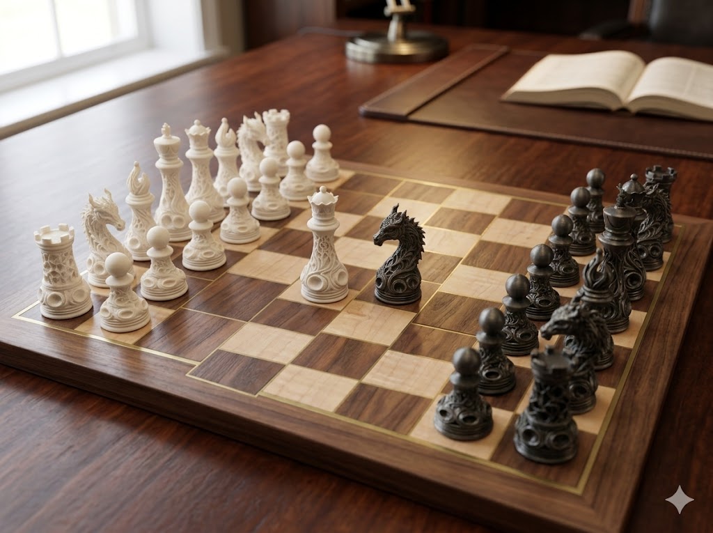 Um Design de Outro Mundo Cada peça deste conjunto de 32 elementos apresenta texturas orgânicas e padrões intrincados que captam a luz de forma singular. O grande destaque vai para os majestosos Dragões, que substituem os tradicionais Cavalos, conferindo um ar temível e nobre ao seu exército. As torres, bispos, reis e rainhas exibem um perfil escultural elegante que convida a ser admirado (e temido) pelo seu adversário.