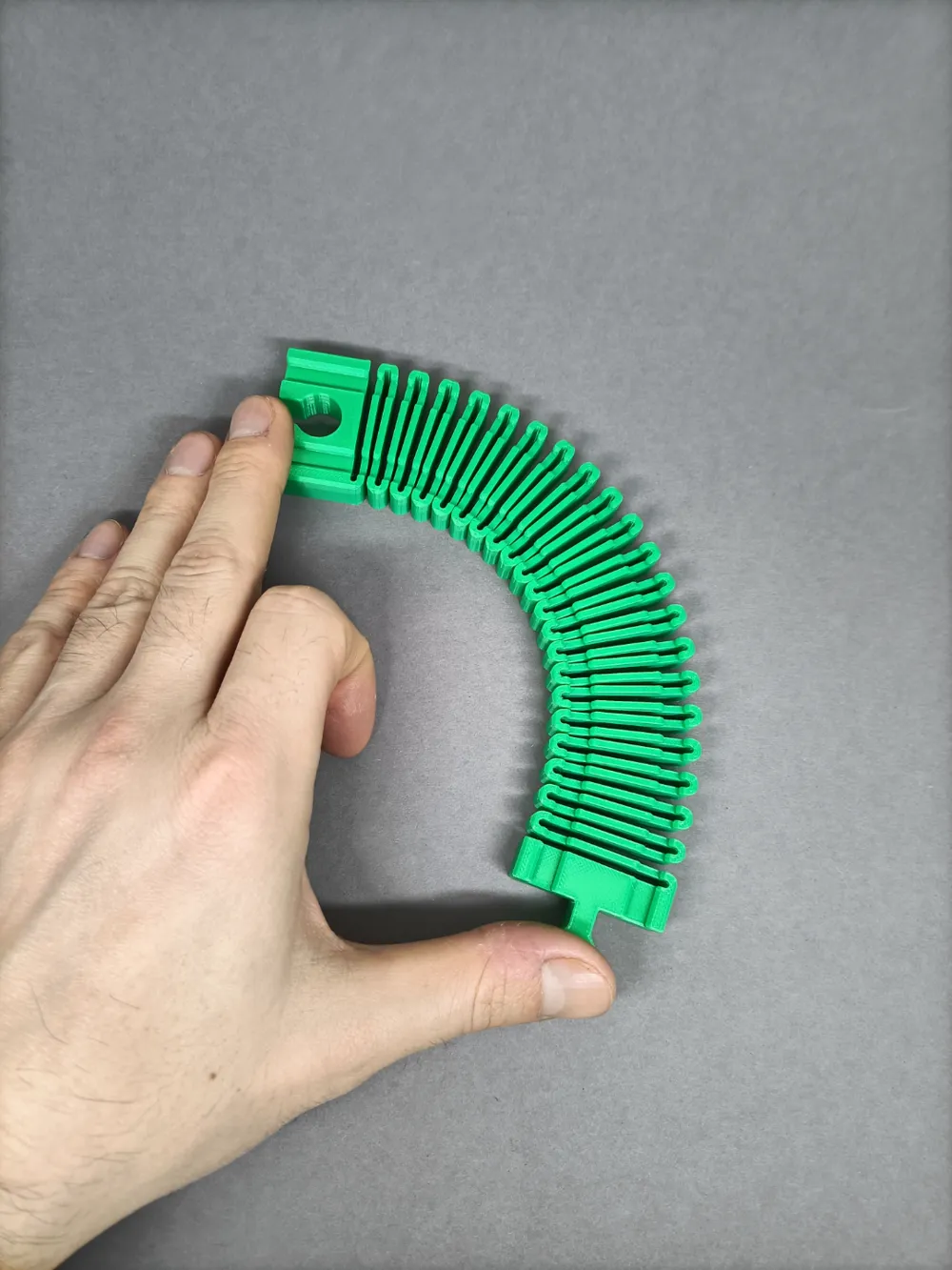 Design Inovador em Acordeão O segredo desta peça está no seu design engenhoso em zigue-zague ou acordeão. Fabricada em plástico durável impresso em 3D, esta estrutura permite que a peça se dobre para a esquerda, para a direita, e se estique ligeiramente para fazer curvas extremas e unir trajetos desalinhados com perfeição. O design inclui os conectores macho e fêmea normais nas extremidades. Pode ser encomendada em várias cores divertidas, como o verde vibrante ou o preto clássico.